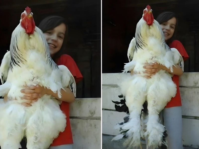 Neither the frightening image of the child holding the enormous chicken nor the child’s unnaturally small size were created by manipulation! The breed of chicken that it is, the Brahma Chicken, is just too big for its own good. It is entirely up to you, whether you find it cute or strange.