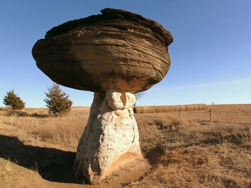 Among the various noteworthy structures in the park are the well-known “Mushroom Rock,” which towers roughly 27 feet (8.2 meters). Together with its surrounding rocks, this remarkable creation has become a legendary emblem of Kansas’s distinctive geological past. The different sized and shaped boulders inspire visitors to imagine more abstract forms while some resemble classic mushrooms.