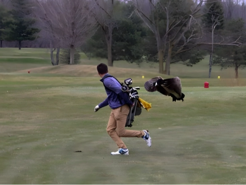 One can find risk even in golf playing. This striking picture catches an event that questions the conventional wisdom regarding golf as a leisurely and safe activity. The picture probably shows an unanticipated hazard or a startling turn of events on a golf course, therefore reminding us that even apparently peaceful pursuits can have hidden dangers. Maybe the picture shows a golfer unexpectedly running across an alligator on an open fairway, or just barely dodging a lightning strike. It might also highlight a wayward golf ball doing unneeded damage or a dramatic golf cart collision. The photographer clearly captures the exact moment of risk or surprise, therefore freezing the action in a way that creates an interesting narrative. The composition might create a visually arresting contrast by contrasting the orderly perfection of the golf course with the chaotic element of risk. This picture not only offers an exciting visual experience but also makes viewers reevaluate their opinions about the sport. It reminds us that in every activity—no matter how innocent it may seem—vigilance and respect of one’s surroundings are vital. The picture might start conversations on the erratic character of outdoor activities and safety precautions in leisure sports.