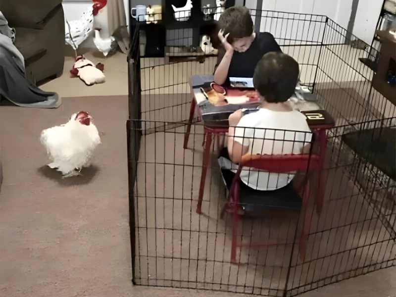 At first glance, a basic picture of youngsters imprisoned in a chicken coop shows a somewhat more complicated and interesting domestic scenario. Though the backdrop elements tell a more fascinating tale, the scene shows two small toddlers apparently caught in what would ordinarily be reserved for fowl. The profusion of chicken-themed decorations and accessories on the surrounds points to this isn’t just any house; one where chickens have attained an elevated status, maybe even becoming indoor pets. The absurdity of the situation is evident: rather than the hens being restricted to their pen, it is the youngsters who find themselves imprisoned while what looks to be a free-range chicken has the run of the house. The keen observer would see the children’s subdued facial expressions, implying this isn’t their first experience with the territorial behaviour of their feathered companion. This role reversal offers a funny reflection on contemporary pet-keeping methods and the occasionally surprising dynamics that show up in homes where animals are viewed as full-fledged family members.