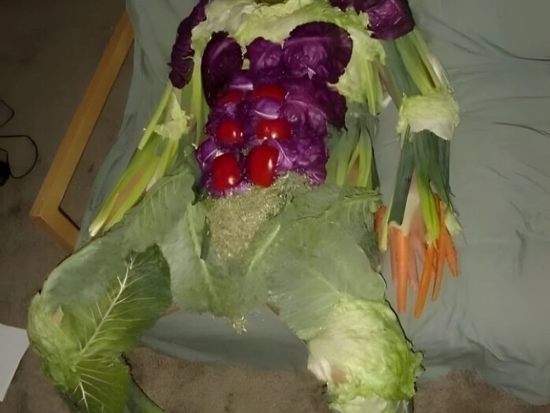Someone has been turned into a live salad bar in this really imaginative exhibition of culinary art meets performance art. The picture shows someone totally covered in an amazing range of fresh vegetables, producing an interesting and strangely lovely image. From the vivid orange carrots to the crisp green lettuce leaves, and with regard to what seems to be several other product items, the precise placement of veggies shows great artistic foresight and patience. The arrangement reflects hours of painstaking positioning, with every vegetable apparently positioned to maximise visual impact. The central arrangement gains a fascinating focal point from the enigmatic spherical objects in the middle—perhaps apples or other round fruits. This performance work begs provocative issues about our relationship with food, consumerism, and the junction of the natural world with human creativity. As a piece of ephemeral art, this odd endeavour must have required significant time and effort, why it is all the more remarkable.