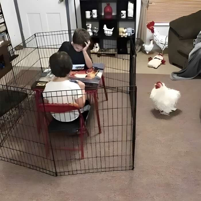 At first, we just assumed that the chickens chased the two kids into the pen since chickens can be pretty mean sometimes, but that might not be what’s going on here. If you look closely, you can spot all kinds of different chicken figures and whatnot in the background. That means someone really loves their chickens and probably keeps the one in this photo in the house on a regular basis.