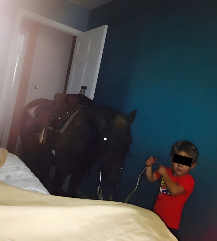 You don’t have to have children to know that they have a tendency to go and wake their parents up as soon as the sun starts to peak over the horizon. However, we’ve never heard of a kid walking into their parents’ bedroom with a pony before. Maybe he thought that the pony was hungry or thirsty. We mean, it would be breakfast time if this was on in the morning.