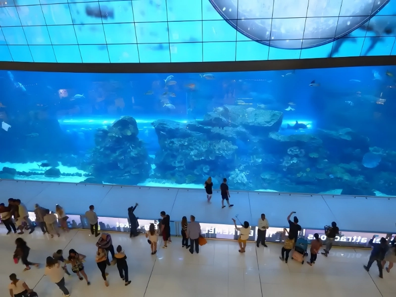 The Dubai Mall Aquarium tank is one of the biggest aquarium displays on the planet, measuring 51 feet high by 32 feet wide. Over 33,000 animals and 272,000 gallons of water are included in one massive acrylic panel. The aquarium tank, valued at an astounding $66 million, submerges visitors below sea level. The tank environment is home to hundreds of fish species, including crocodiles, manta rays, sharks, and eels.