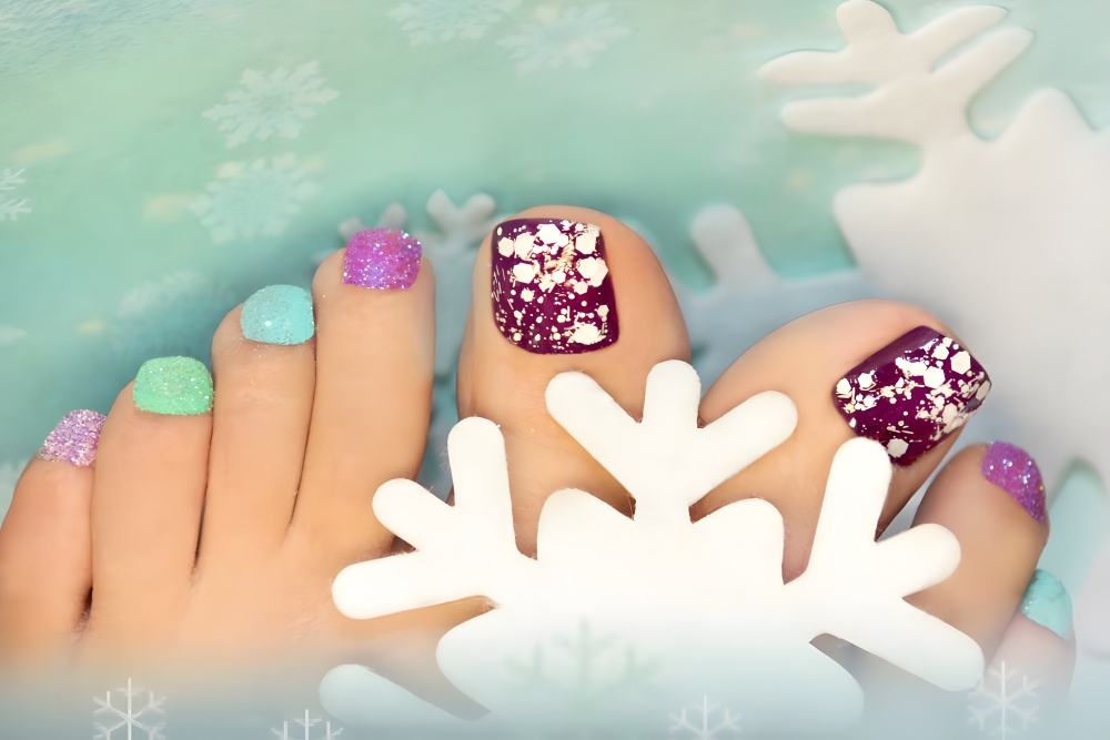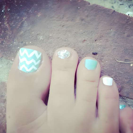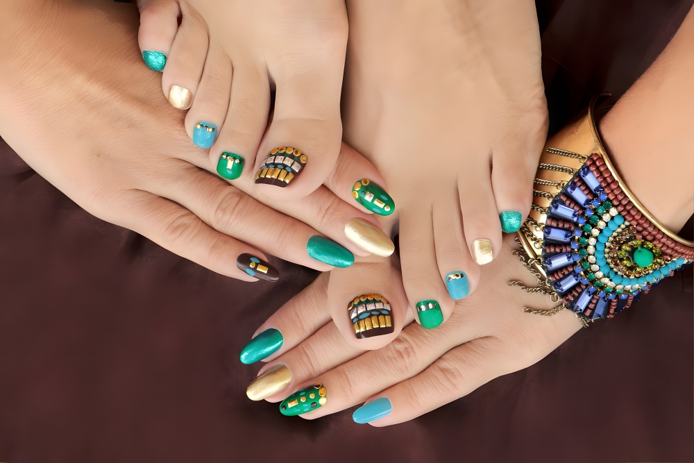 You can also go for these mani-pedi patterns that go well together, using green and blue nail polish and adding a dash of extra color on the big toenails. It’s so intricate but fun!