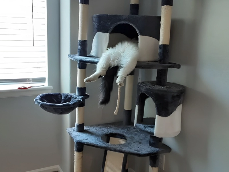 Although the owner of this ostentatious cat tree meant well when they bought it for their kitty, did they not realise that this would be much too much exercise for their pet in one day? This cat apparently chose to slumber in its small burrow to gather its breath and relax before the major climb since it seemed as though it simply couldn nearly reach the summit of this tree. Rising magnificently in the room’s corner, the multi-tiered cat tree stands for both ambition and reality in harmonic balance. The cat’s total submission to gravity—its legs hanging pathetically outside the small cubbyhole—makes this sequence especially funny. The scene captures exactly the usual feline attitude to life: why work when you might simply curl up for nap? It seems so exhausted that it lacked the strength to raise its legs! Still, we imagine this kitty needed it. You know, being a cat climber is more difficult than it seems. This last stop on demand has become the kitty’s favourite place since it shows that occasionally the trip is more crucial than the destination.