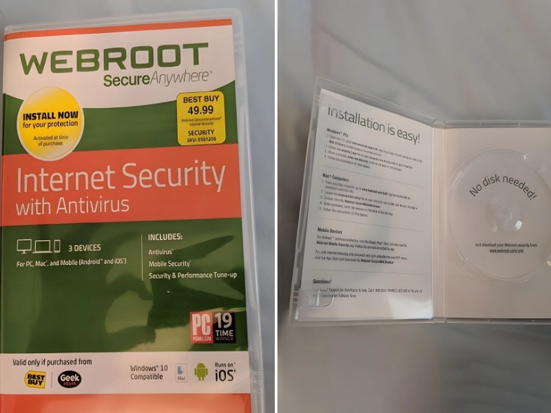 It’s unclear if Webroot had a malicious purpose to trick users into downloading an antivirus program or if the marketing team simply came up with a truly stupid concept. It is evident that “no disk needed” is required for installation, yet you purchase a disk holder for the program.