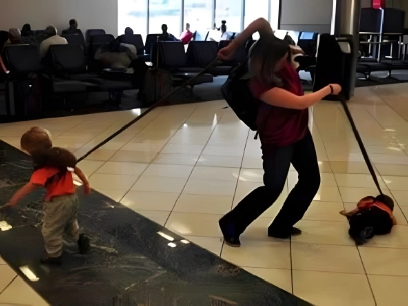 Imagine the stress of traveling with small children—it may be quite the ordeal already. It can be quite difficult to balance keeping your kids calm with making sure they are all there. The sequence in Home Alone 2 where Kevin boards the plane to New York City by himself is a great illustration of the need for parents to keep a close eye on their kids. This woman chose to put her children on leashes in order to prevent them from running off, but it didn’t seem to be that effective in actuality.