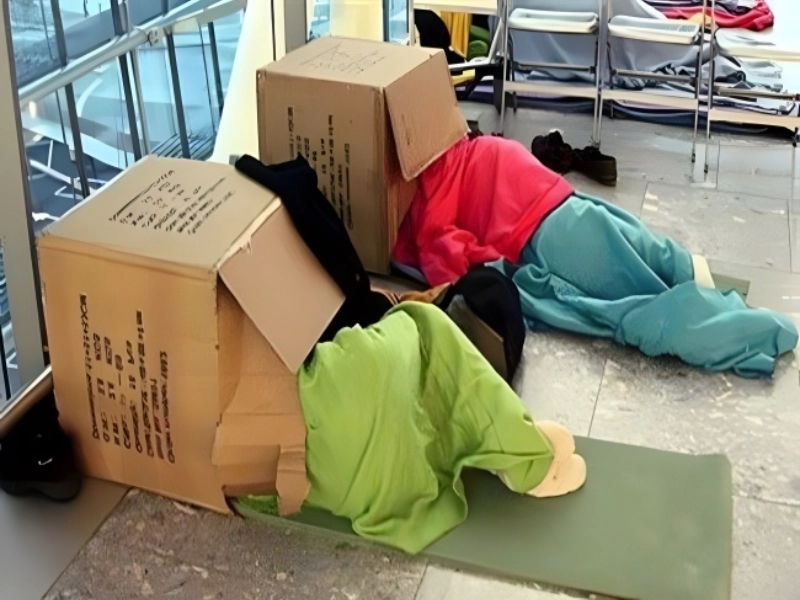 There are some natural disasters that are unavoidable and have a devastating impact on the local population. These individuals were stuck at the airport for days with no flights scheduled because they were attempting to return to their home in Asia but were being hindered by poor flying weather. But they made the extraordinarily clever decision to utilize cardboard boxes as temporary beds. It worked even though they looked like homeless people!