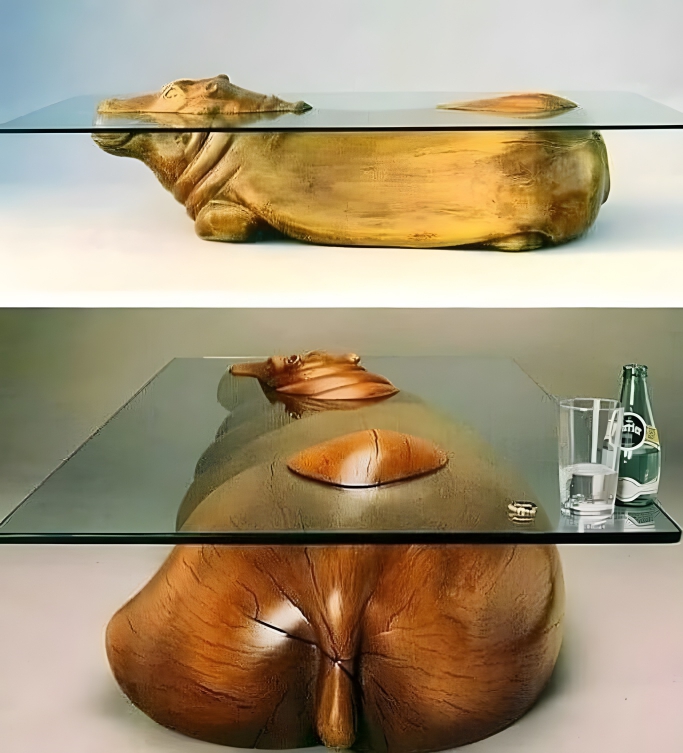 This hippo might be wondering why it’s there, in the middle of your living room, with a pane of glass over its head. Thankfully, you don’t have to answer to any tables.