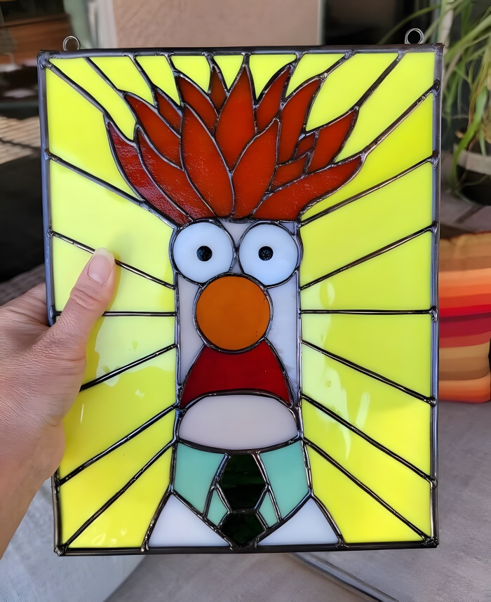 This one-of-a-kind stained glass panel is starring none other than Beaker, the perpetually panicking Muppet that everyone knows and can’t help but love. This handcrafted masterpiece perfectly encompasses the spirit of Beaker, complete with wide eyes and that unforgettable red shock of a hairdo. It’s definitely a conversation piece, mainly consisting of people wondering if that’s who they think they are before asking how they could get one of their very own.