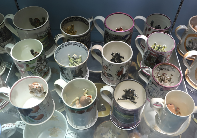These mugs are the ultimate punchline in porcelain comedy- if that were even a real thing. Designed by a prankster potter, these quirky cups were the perfect way to give Great Aunt Mabel a fright with her morning tea. With an uncannily realistic amphibian lounging casually at the bottom, they turn a harmless cup of Ear Grey into the kind of nature documentary that nobody ever wants to be a part of.