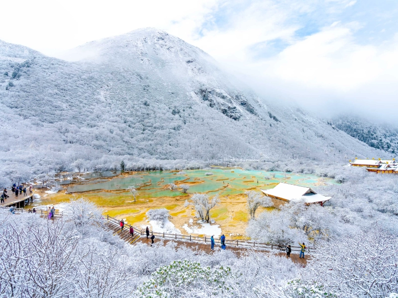 In Huanglong, the quiet and magical experience provided by the deep winter months of January and February appeals to guests Snow and ice completely changes the scene, producing a perfect white canvas broken only by the still frozen ponds. Under winter, the mineral deposits acquire fresh qualities; ice forms give still another depth to the already amazing landscape. Around the thermal zones, the low temperatures produce unusual events whereby steam rises sharply from the warmer waters. Especially during the golden hours, the winter light conditions provide amazing chances for photography as the sun’s rays interacts with the snow and ice. The fewer visitors during this time provide a more alone view of the winter grandeur of Huanglong. The dynamic visual experience produced by the juxtaposition of the frozen terrain with the flowing waters perfectly captures the force and beauty of winter nature.