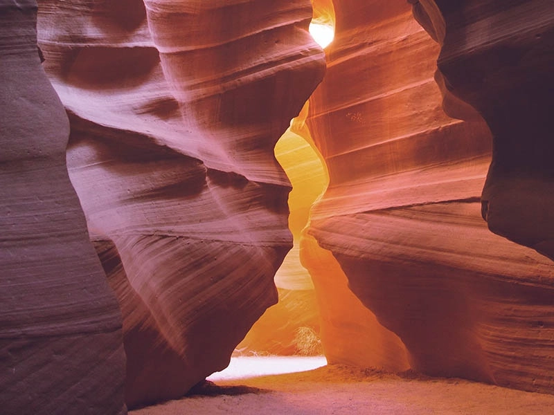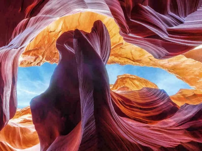 Nestled in the middle of Upper Antelope Canyon, this fabled point of view provides what many feel to be the most breathtaking outlook in the whole canyon system. Here the walls curve and flow in inconceivable directions to provide an amazing show of shadow and light that seems to challenge reality. While shaft of lights penetrate through at exact angles, generating the well-known light beams photographers pursue, the sandstone seems to pour like liquid from above, frozen in time. From deep purples and blues to dazzling oranges and reds, the walls at this point show an amazing spectrum of colours, all shifting with the angle of the sun and time of day. The way several apertures in the canyon ceiling produce a sophisticated interaction of light beams during midday hours makes this location especially amazing. Summertime sees the ideal viewing period between 11 AM and 1:30 PM when sunlight strikes at the ideal angle to produce what photographers refer to as “the light show.” Having been polished by innumerable flash floods, the walls here have remarkably smooth textures that provide ideal reflecting surfaces for the light to bounce and play.