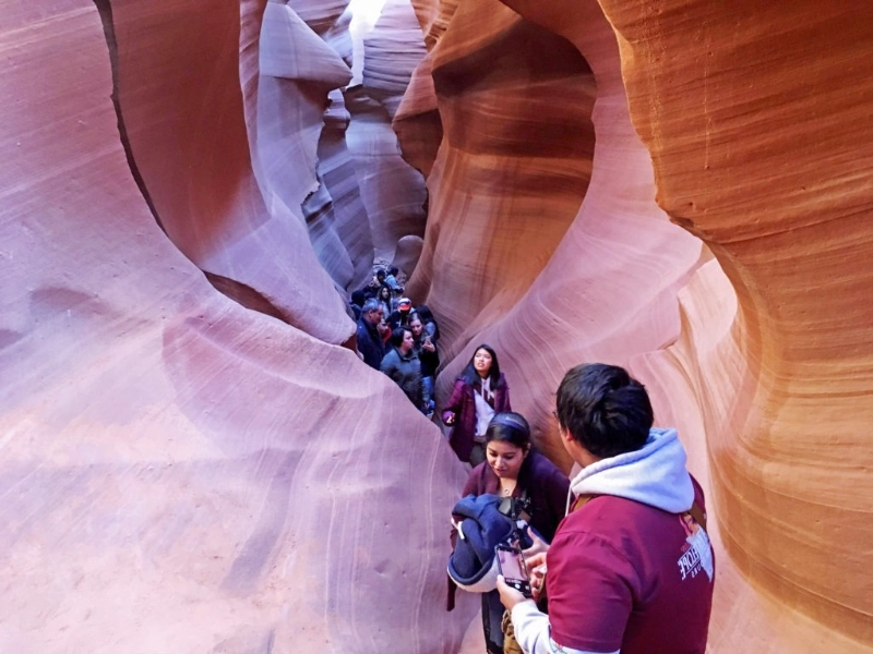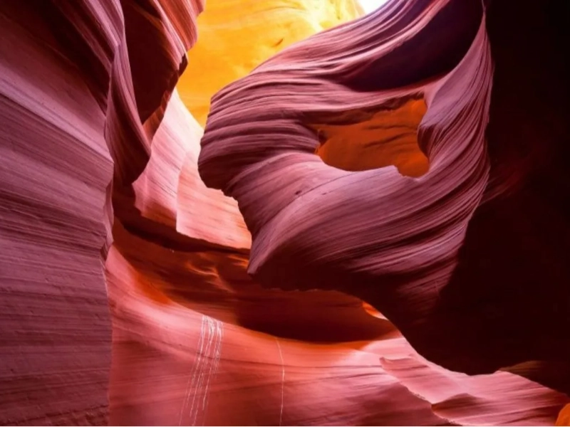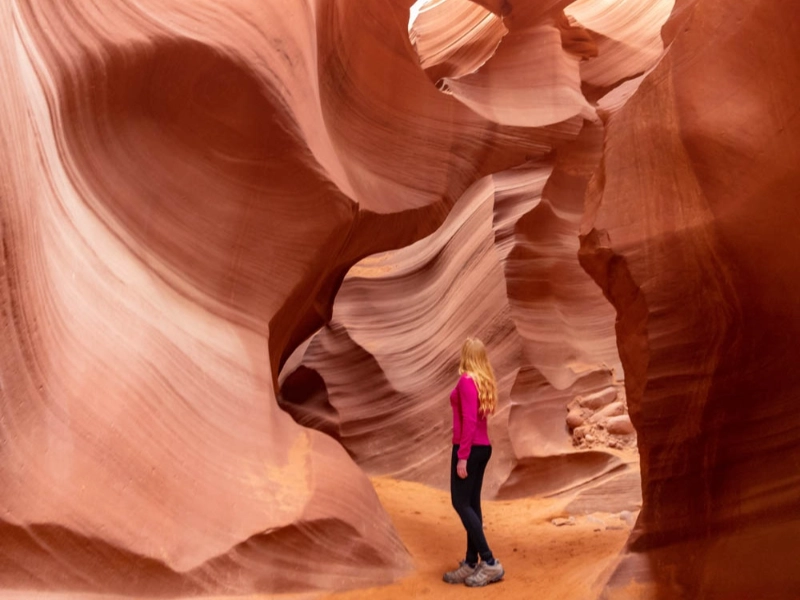 Looking upward, this unusual part of Upper Antelope Canyon got its name from the hourglass-shaped feature seen there. A natural optical illusion that plays with visitors’ perception of scale and perspective is created when the walls narrow greatly at the middle then spread once more towards the top. Depending on the time of day, the smooth, curved walls here highlight some of the most vivid colour variances in the whole canyon—from deep amber to brilliant orange. Sunlight streaming through the little aperture produces amazing light effects that give the walls internal glow at noon. Particularly remarkable are the acoustics of the chamber; even small sounds create fascinating echoes that accentuate the mystical ambiance of the room.