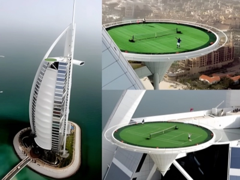 The Burj Al Arab hotel in Dubai offers luxurious dining and views from its rooftop tennis court, which is situated over a thousand feet above the ground. In 2005, tennis legends Roger Federer and Andre Agassi inaugurated the world’s tallest tennis court through a dramatic PR stunt. This occurred right before the Dubai Duty-Free Open got underway, instantly making the sport and the location iconic.