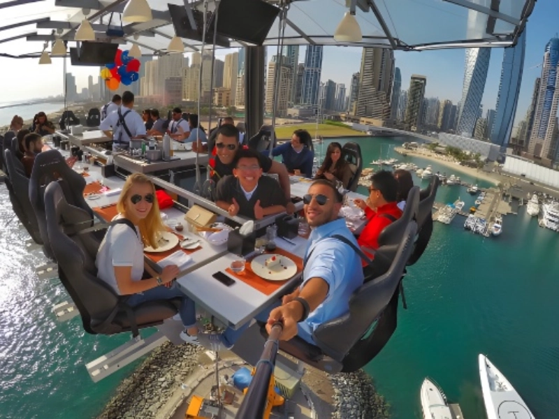 People, buckle up. There are seat belts, we promise. Safety comes first, right? With the entire dining table rotating, you can see a full 360-degree panorama of Dubai’s shimmering lights. Everything is the best seat—don’t compete for the best view! Is this expensive? Yes. It will cost you $191 for dinner. But really, where else can you simultaneously dine, float, and feel like being Aladdin on a magic carpet ride?