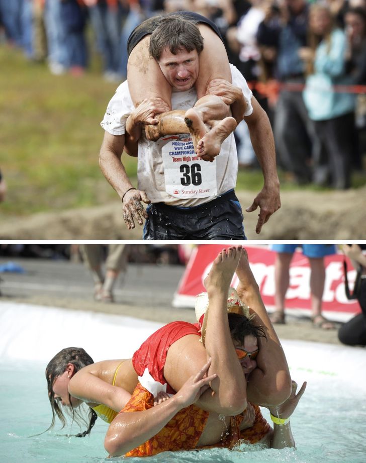 Every July, in Sonkajärvi, Finland, something extraordinary happens: people from all around the world arrive to find out who will finish an obstacle course first with their wife on their back? This weird sport has rules: women have to be older than 17 and their weight should be at least 108 pounds. What motivates people to take part in this weird competition? The winner gets as much beer as his wife weighs.