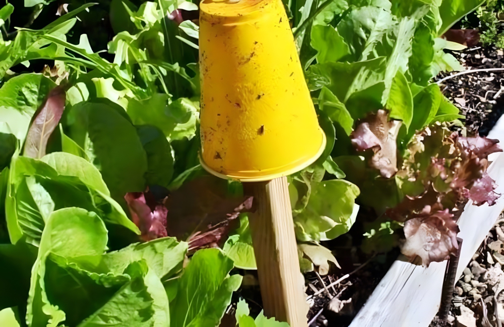 Take the yellow cup, invert it, and stick it on the stake. Plant the stake in the ground. As a final touch, add a thick layer of Vaseline to the yellow cup. The aphids will be drawn to the color, yet they will get stuck in the Vaseline, keeping them far from your plants.