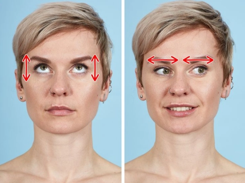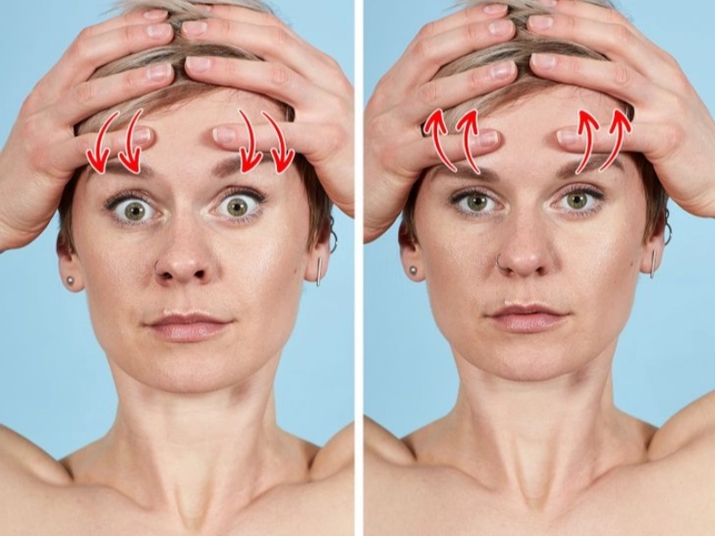 このエクササイズのおかげで、額の筋肉の緊張が改善されます。イラストのように、額に指を置きます。驚いたように眉を上げたり下げたりします。額にしわがないか確認してください。このトレーニングを 10 回繰り返します。