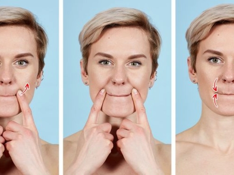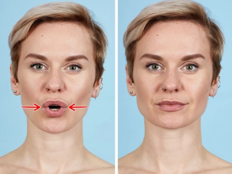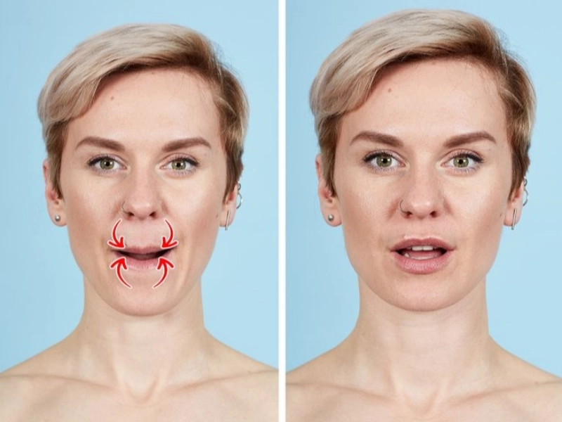 このエクササイズは、強い頬骨と頬の色合いを維持するのに役立ちます。唇を口の中に差し込みます。唇の端に指がかすかに触れるのを感じるはずです。唇の外側の端を耳に近づけます。出発点に戻りましょう。このトレーニングを 10 回繰り返します。
