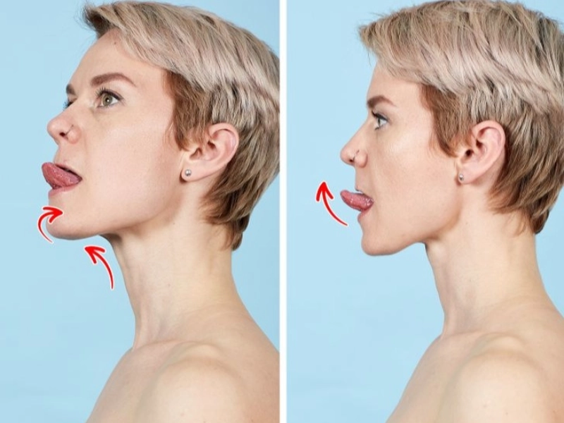 このトレーニングは、二重あごを解消し、首の筋肉を引き締めるのに役立ちます。舌を上に伸ばします。頭を半分まで上げたら、右に曲がります。あごを上げます。10秒間維持します。開始位置に戻り、同じ動作を使用して反対方向に進みます。この練習は各方向に 5 回行う必要があります。