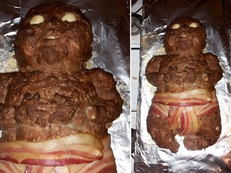 even in its gruesome form. For some reason, this individual decided to mold the meatloaf into a baby, complete with a bacon diaper for the baby’s mouth and eyes and onions for its eyes. In addition to being frightened, we’re worried. How did it taste?