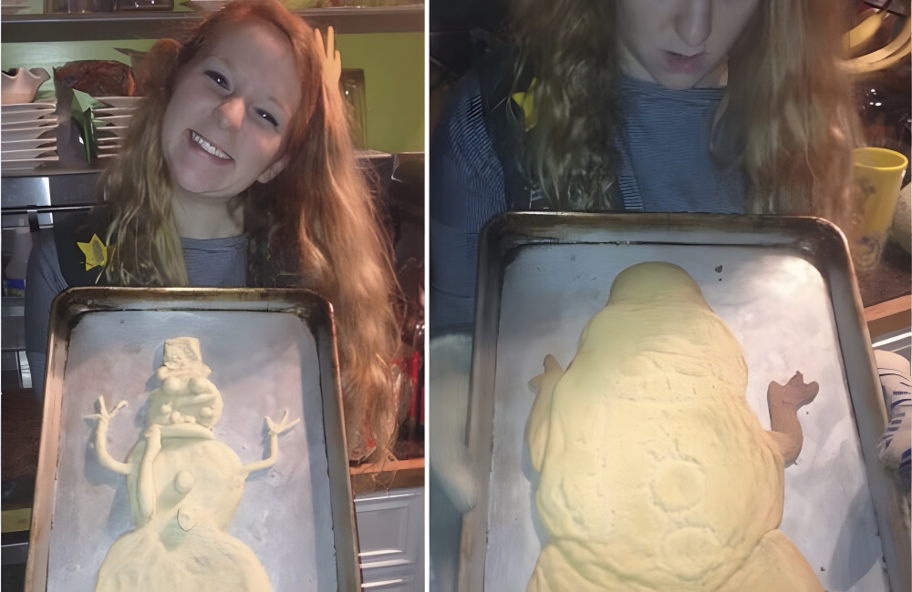 Always make sure to account for expansion when you’re cooking. Things expand in the oven, and by “things,” we mean dough and batter. To take this picture as an example, what looks like a cute snowman on the tray might turn into something else after baking.