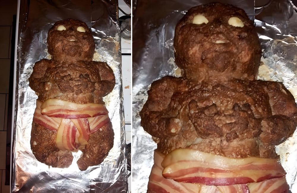 Even when it’s in horrific form. This person, for some unknown mad-genius reason, chose to make a baby-shaped meatloaf wearing a bacon diaper with onions for its eyes and mouth. We’re horrified and concerned (also, how did it taste?).