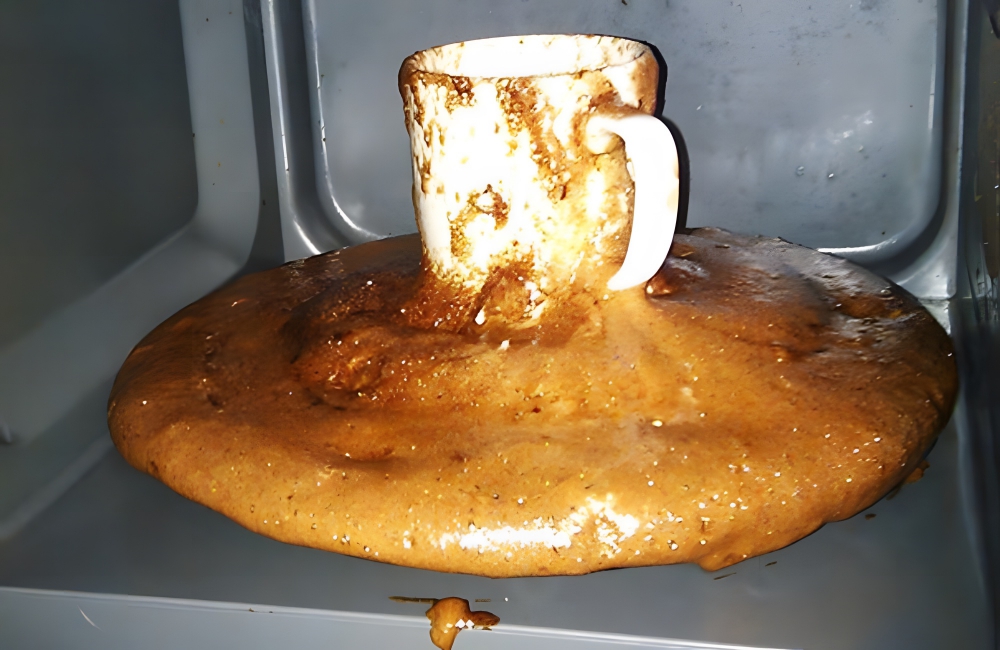 It’s hard to tell what the problem was here—the cup or the thing in the cup. What’s crazy about this photo is that the cup appears to be empty, which means it exploded strong enough to send all of its contents out into the microwave.