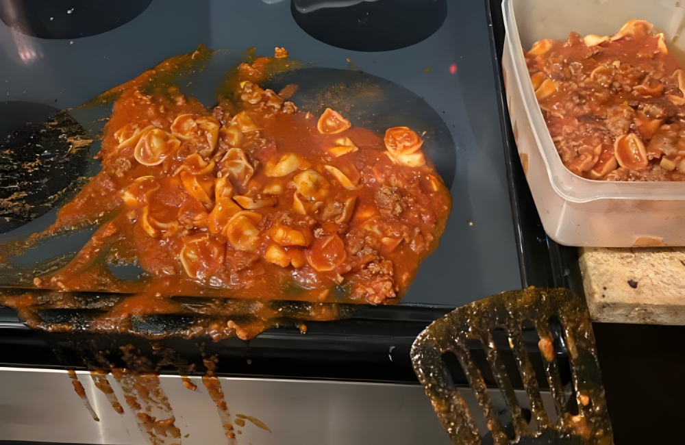 According to @arkhangelllsk on Instagram, they were emptying their cooked sauce and pasta into a container. But, they put the container on the hot, left burner. As a result, the pasta was “full of strings of burnt plastic.”