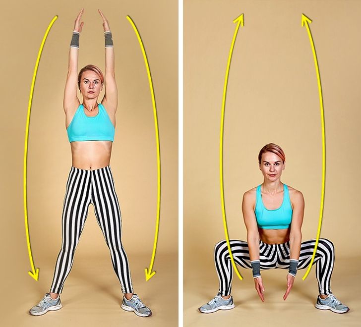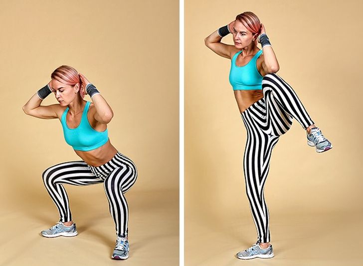 A tough exercise with a lot of work for your knees. Do it carefully, and don’t squat too low. At the beginning, you might also want to hold on to something.