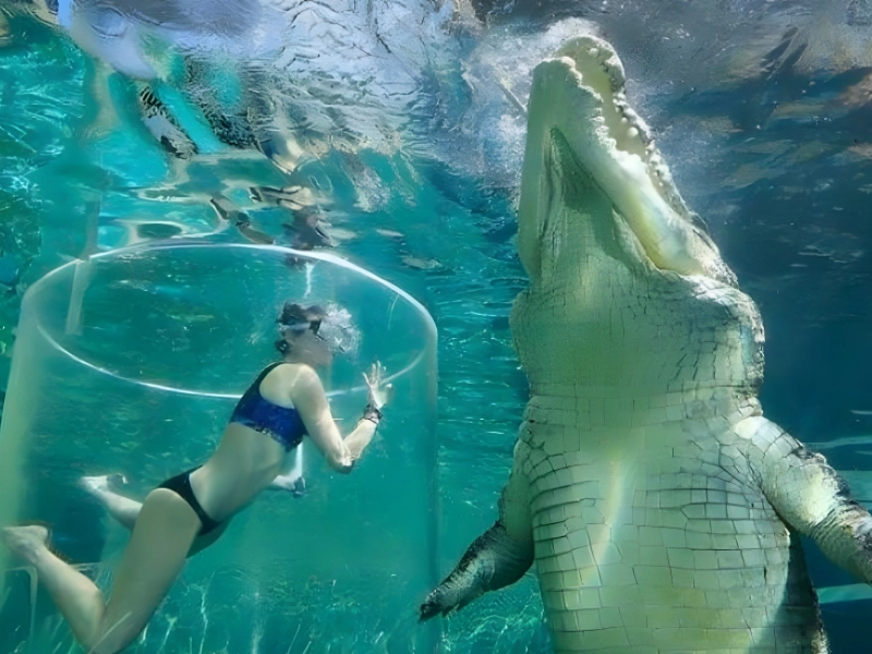 Given that saltwater crocodiles are significantly more ferocious than any other species, the woman in this photo is fortunate to be in a protected cage. Even though they’re prepared and eager to attack people, they’re not very fast, so you should have a fair chance of outrunning them if you’re in good form.as long as they don’t approach you from behind.