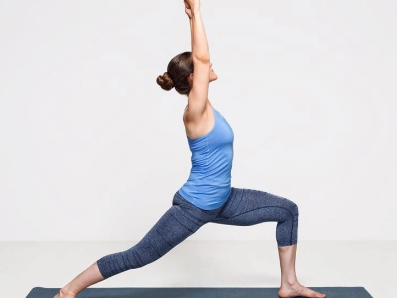 To begin, start in a standing position at the front of your yoga mat or other stable surface. Take a large step back with your left foot, rotating it 45 degrees towards the center of the mat. Keep your right foot facing forward, with your knee bent at a 90-degree angle, directly above your ankle. Your back (left) leg should remain straight.