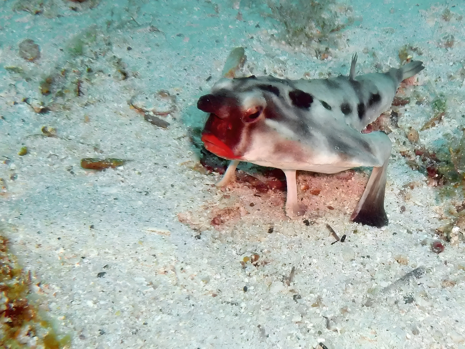 Interestingly, red-lipped batfish are not the most graceful swimmers—they are better suited for “walking” along the ocean floor. When they reach adulthood, they use their dorsal fin as a fishing lure to attract prey instead of for swimming.