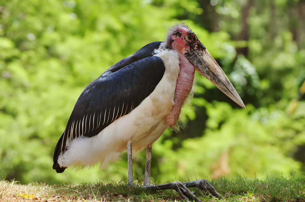 This stork species also stands out for its gular sac, a long, reddish pouch that hangs from its neck and is used to make grunts and other noises during courtship rituals—not for food storage.