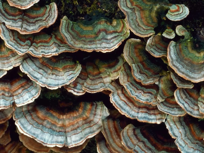 Scientifically referred to as **Trametes versicolor**, the intriguing mushroom known as **turkey tail** gets its name from its similarity to the vibrantly coloured tail feathers of a turkey. Not just aesthetically arresting, this species is ecologically important and helps greatly in forest ecosystems. Found all around, mostly in North America, Europe, and Asia, the turkey tail is a typical sight on rotting wood and tree stumps where it grows as a saprophytic fungus. Its age, surroundings, and substrate on which it grows all affect its decorative look—which ranges from rust-brown to grey and black.