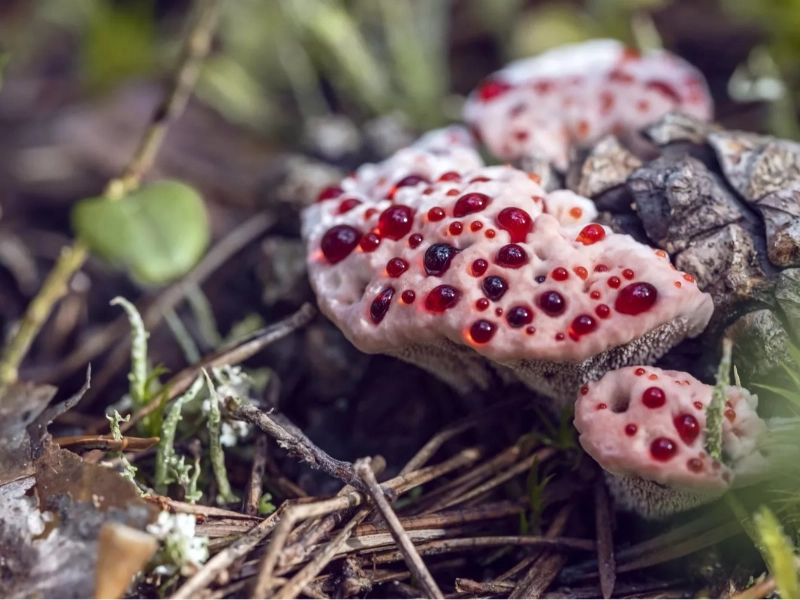 Scientifically called **Hydnellum peckii**, the **bleeding teeth mushroom** is fascinating and frightening. When young, this mushroom is readily recognisable because of its remarkable ability to produce bloodlike, brilliant-red, technically xylem sap droplets from pores on its white crown. Its eerie look from this “bleeding” effect could turn off some but excite others.