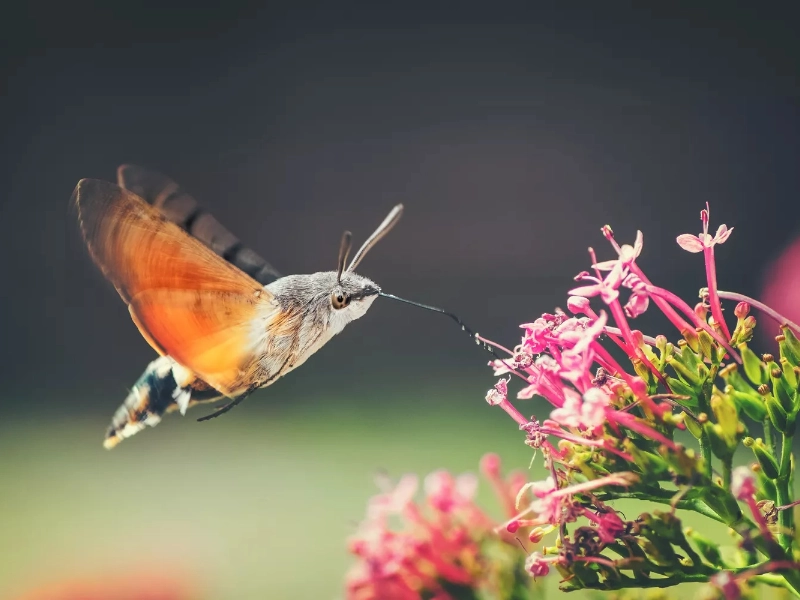 The hummingbird hawk-moth’s very long proboscis—a tubular mouthpart that may reach almost twice the length of its body—is one of its most fascinating traits. Like a hummingbird’s specialised beak, this amazing modification lets the moth reach nectar from deep within blossoms. Usually kept coiled and neatly tucked under the head of the moth, the proboscis is kept Combining this complex feeding mechanism with the moth’s hovering ability helps it to eat a wide range of flowers, even those with deep corollas that are unreachable to many other insects.