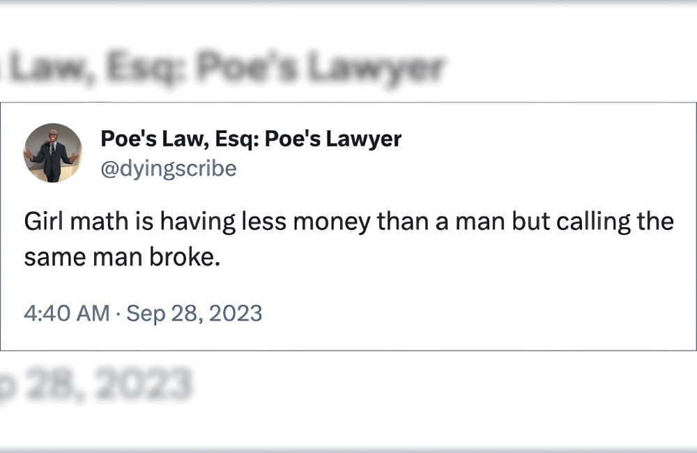 Girl math dictates that a man who has less money is broke, even if the money he has is less than what you have. In simple words, your position to consider someone broke does not change with how much money you have, but rather how much the guy has.