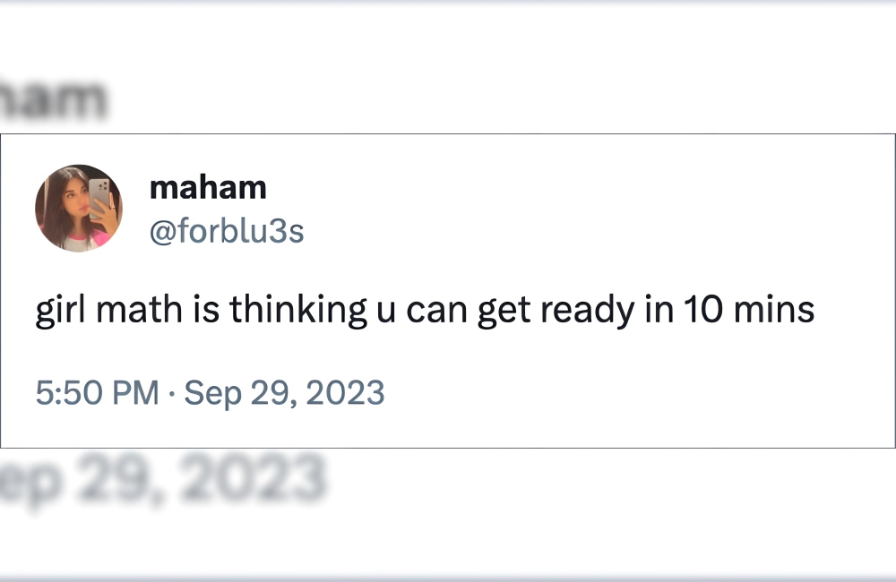 Girl math is delusional, and prompts you to make delusional choices, like thinking that you can take a bath or get ready within ten minutes. These ten minutes almost always end up getting extended to thirty, which is why people all over the world have a common perception that women take just too long to get ready.