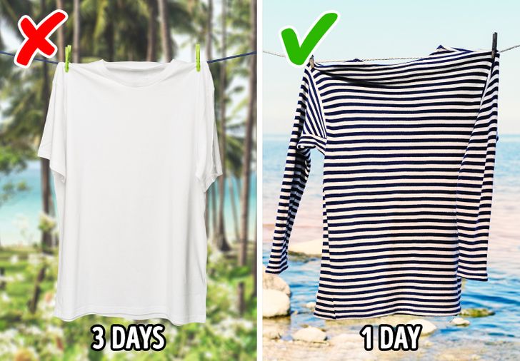 Laundry dries faster if you hang dry towels between rows of washed clothes. If a piece of clothing is still damp but you really need to put it on and leave, then you can just wrap it up in a dry towel and put it in the washing machine to help get rid of any remaining moisture.