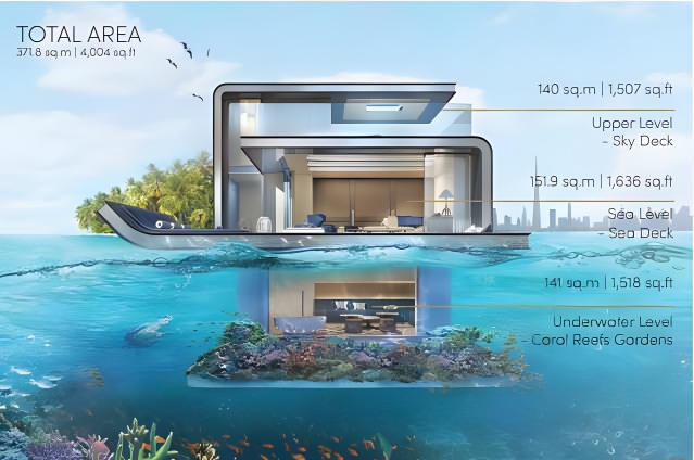 Picture this—a three-story villa that floats on water, partially submerged around the World Islands, an audacious man-made archipelago shaped like a world map. Developed by Nakheel Properties and set in the Heart of Europe area of the World Islands, these villas boast a unique three-level design with a jaw-dropping underwater bedroom and bathroom. The 4,000-square-foot space immerses residents in an aquatic utopia, surrounded by artificial coral reefs and vibrant marine life. Above sea level, the villas continue to dazzle with floor-to-ceiling windows, an open-plan living area, and a dining space that extends onto a sun deck. But the opulence doesn’t stop there—ascend to the uppermost level, and you’ll find a mini-bar, kitchenette, and even a glass-bottomed hot tub with panoramic views of Dubai’s skyline and the Persian Gulf.
