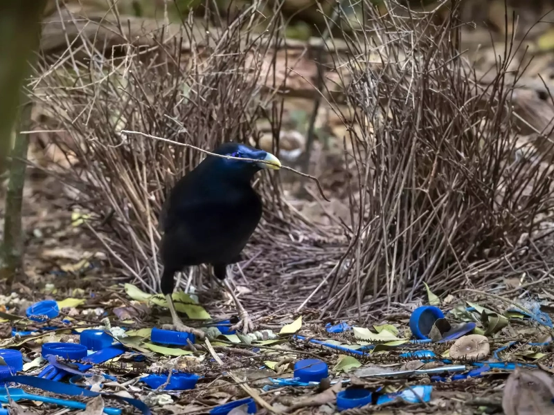 Depending on the species, the male bowerbird devotes a lot of time and energy to create his bower. While some bowers could be an open space covered in vibrant things, others seem like complex tunnels or avenues. Men typically gather a variety of materials, including twigs, leaves, and even man-made objects including bottle caps, beads, and shards of glass; the building process is exact. Men want to present a visually pleasing display that grabs the interest of possible mates, hence the choice of decorations is quite important.
