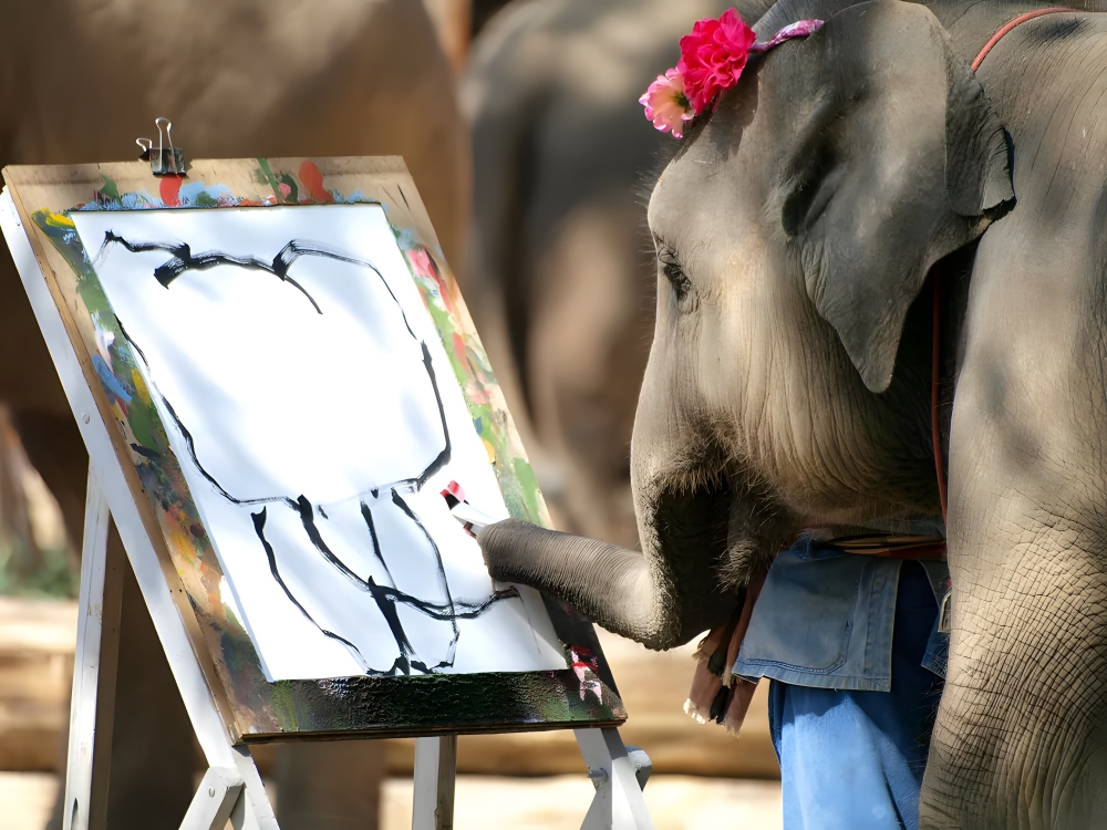Elephants have a remarkable ability to use tools, utilizing their dextrous trunk like an arm. They use branches to scratch parts of their body that their tail and trunk cannot reach, use leaves to swat flies, and chew on bark to make it spongy enough to absorb scarce drinking water. But perhaps the most stunning accomplishment of elephants is their artistic ability. Some zookeepers have given their elephants paintbrushes, and the sensitive beasts have shown quite a propensity for painting.