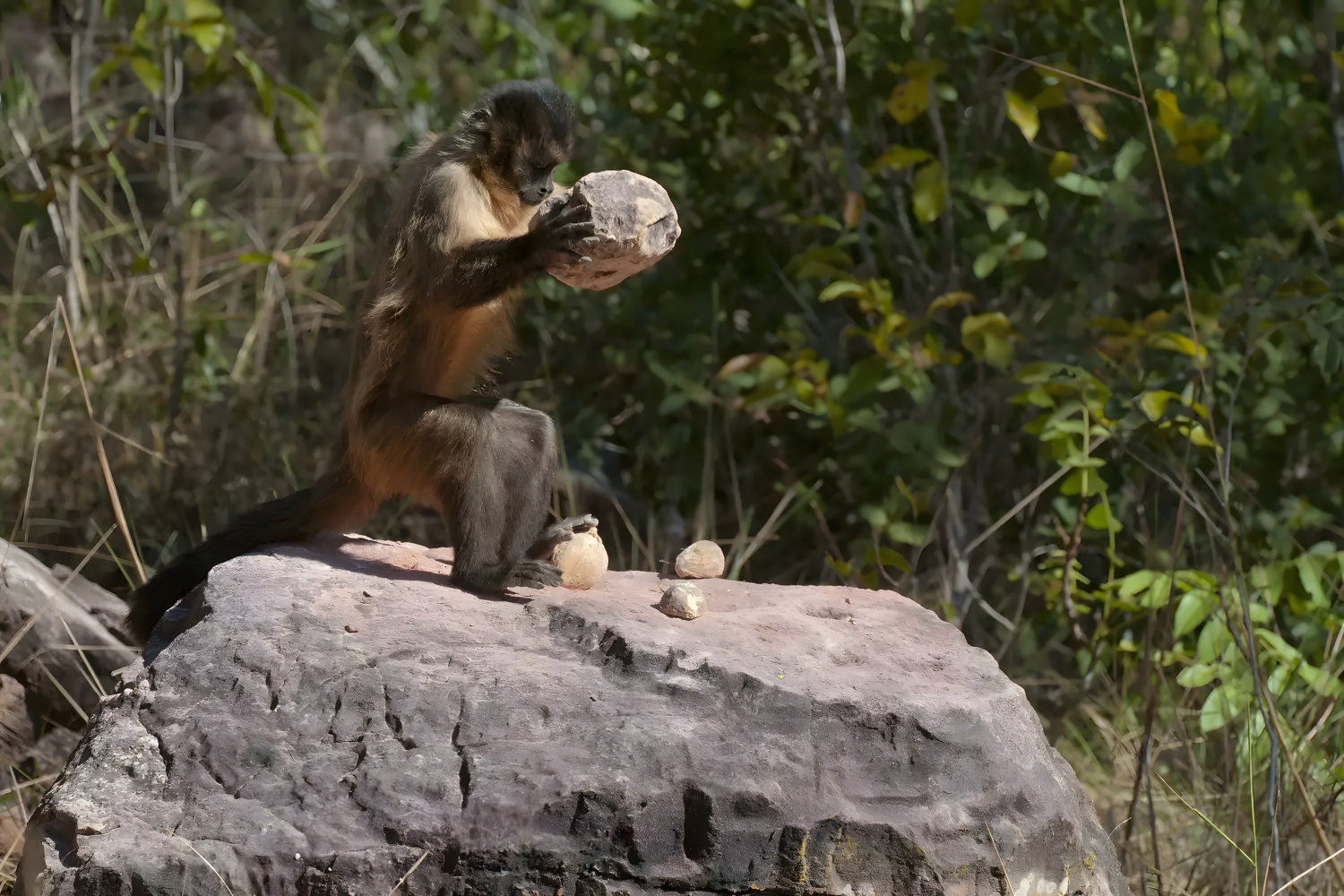 The most common example of intelligent tool use in capuchins is the way they crack open nuts, which is by placing them on pitted stone “anvils” and then hitting them hard with another rock. According to the archaeological study, they adjusted the size of their tools—using smaller rocks for seeds and softer nuts—over time. Another remarkable example of the intelligence of capuchins is the way they rub crushed-up millipedes on their bodies to repel mosquitos and other insects.