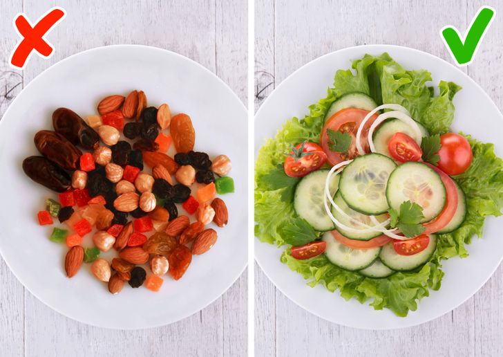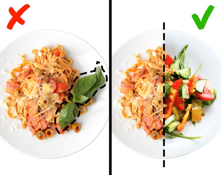 A professor from Pennsylvania conducted a study and came to this conclusion: large portions of food or meals containing a lot of water are a great way not to overeat. A big bowl of salad will fill your stomach much faster than a handful of nuts, and this will make you feel full.