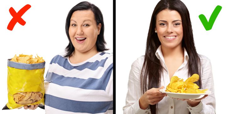 You can quickly eat a huge amount of chips, cookies, or candy from a big pack in 5 minutes. Put the snacks on a plate, or sort them into smaller bags: this will help you control how much you have eaten and when it is time to stop.