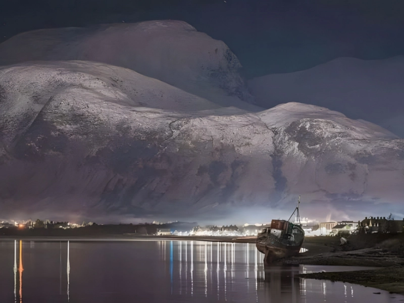 The mountains rising in the backdrop of this picture, which was taken in Lochaber, Scotland, give the impression that they are going to engulf the area. Famous for its breathtaking scenery, Lochaber is home to Ben Nevis, Glen Coe, and stunning coastlines.
