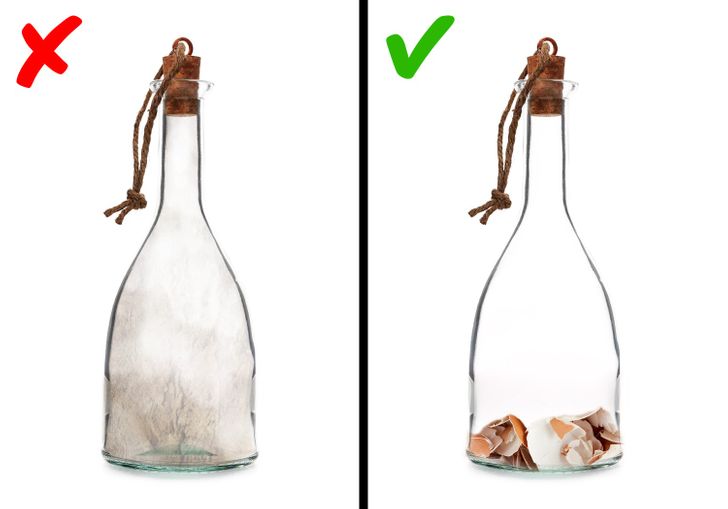 Eggshells work well for cleaning narrow-necked bottles. Place eggshells in a vase or bottle and lightly dilute with dish soap. Give it a shake, and then give it some time to settle. Next, drain the mixture and give the bottle a thorough cleaning.